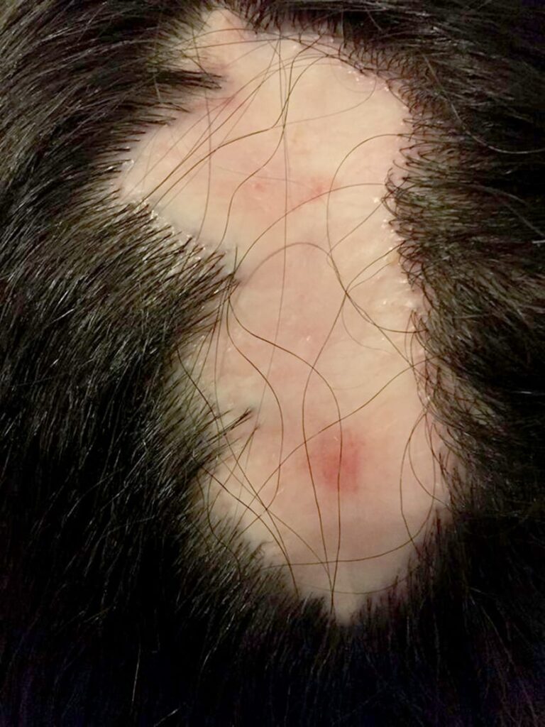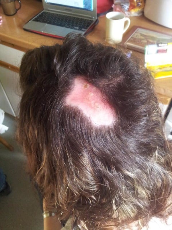“My hair began to attach to the pus and scabs that were forming on my scalp as a result of infection, and I found that moving my face or altering my facial expression moved my scalp, exacerbating the discomfort.”