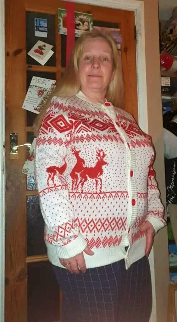 When Carolyn Hallam, 53, bought the knitwear at a car boot sale, she didn’t notice the romping reindeer on the front.