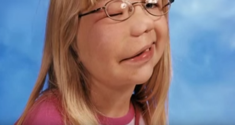 Sarah’s tumor developed alongside her: “It grew with me.” It’s sometimes difficult to hear in my right ear since it pulls everything down. “My right eye is a haze.”