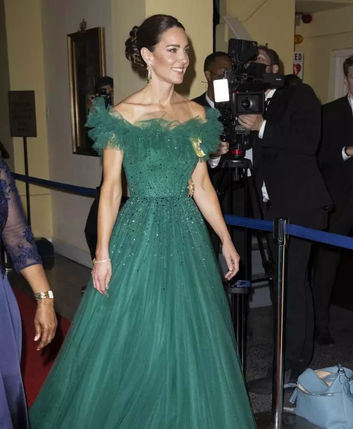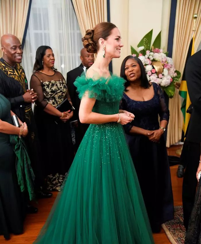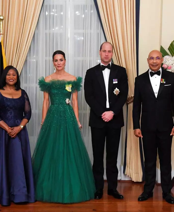 On Wednesday, Prince William, 39, and Kate Middleton, 40, attended a dinner hosted by Sir Patrick Allen, governor of Jamaica’s island state (March 23rd). Kate Middleton made a stunning entrance in an emerald green gown. The Duchess of Cambridge looked stunning in an emerald green Jenny Packham gown with vibrant embellishments and no straps.