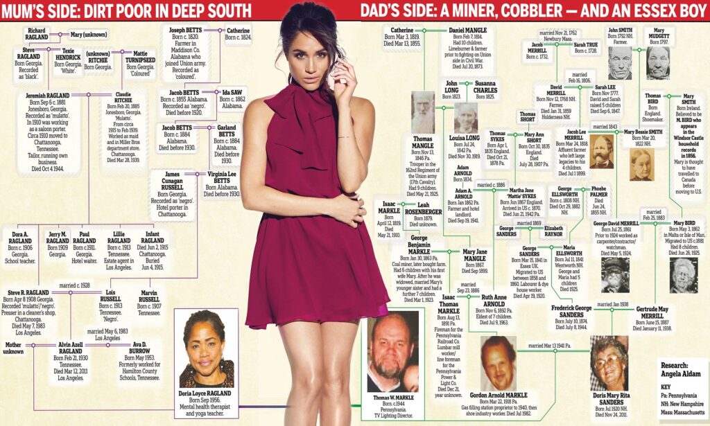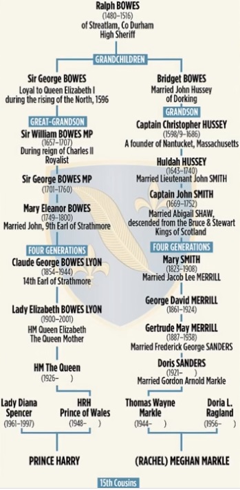 The film director Thomas Markle, who is the Duchess of Sussex’s father, has an ancestor who was named Ralph Bowes who was from England. Between the years 1480 and 1518, Bowes worked as a magistrate in the English county of Durham. Bridget Bows, Ralph Bowes’ niece, had a blood-related descendant named Doris Sanders, who gave birth in 1921 and went on to become the mother of Thomas Markle, seven generations later.