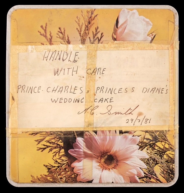 The cake tin has been kept with a note which reads: Handle with care. Prince Charles and Princess Dianes wedding cake, M.C Smith.