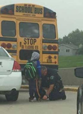 Fortunately, Police Officer Klinge saw the little boy walking alone on the street at that time of the morning and decided to offer him a walk to school, trying to get there in time so as not to miss the trip. Once at the destination, Klinge noticed that something was wrong: the child had one of the laces untied, so he got out of the car, bent down, and tied his shoe, wishing him a wonderful trip with his friends. Christina, one of the mothers who watched that tender scene, wrote on Facebook: “This morning, I was waiting in the parking lot to follow the school bus in which my girls were going on a trip. While I was parking, this policeman stopped, got out of the car to help this little boy. Personally, I think he missed the bus and this policeman noticed him and brought him to school. She helped him out of the car, bent down to tie his shoelaces, and then walked away. Isn’t that amazing? I don’t know the name of this officer, but I felt I had to share this with you so that the world could see that not all police officers are bad. ”