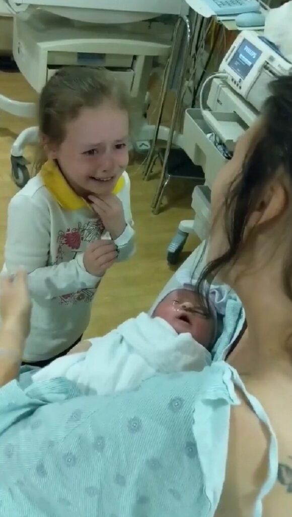 The little girl meets her newborn sister, and her reaction makes everyone cry.