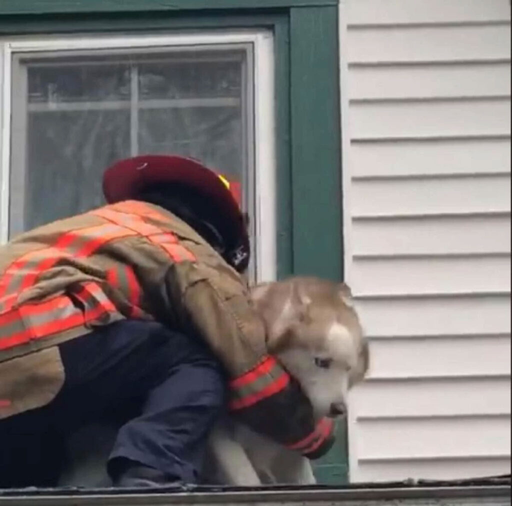 A Husky jumped out of a window, landed on the roof of the house, and got stuck there. See his adorable reaction when a firefighter tries to save him