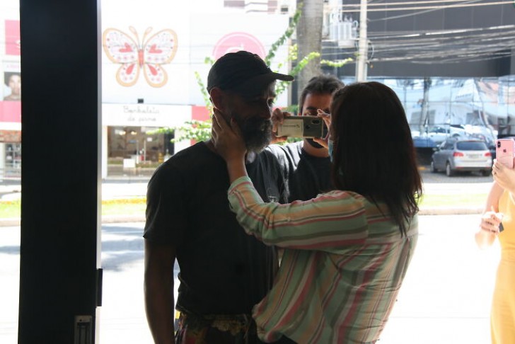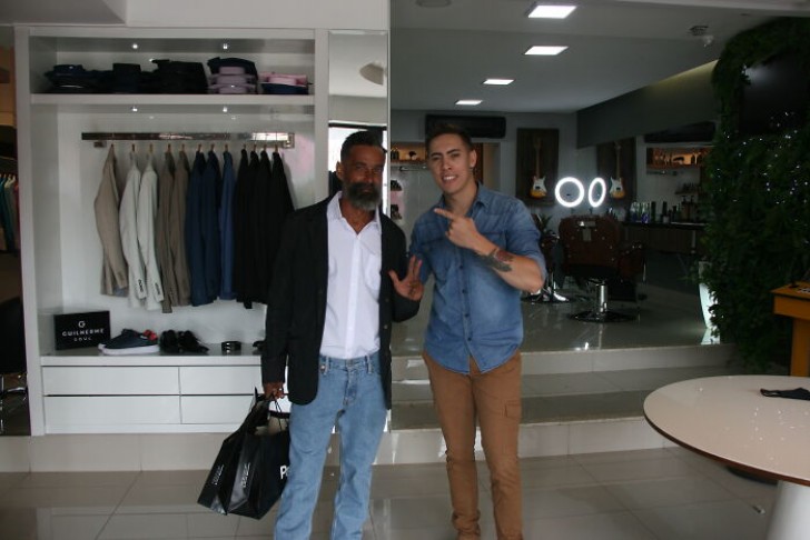 Alessandro cut his hair and trimmed his beard, but the other hairdressers also wanted to help João: some bought him new pants, three T-shirts, a jacket, and a new pair of shoes. João washed and perfumed himself during a day dedicated only to him.