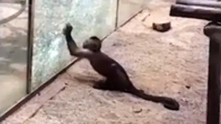 The video shows the zoo’s resident Colombian white-faced capuchin (Cebus capucinus) standing near the glass wall and holding the pointed object aloft with both hands before repeatedly pounding the window.