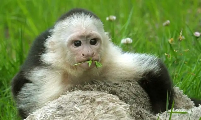 The monkey kept fleeing into the forest, so retrieving the puppy was no easy task.