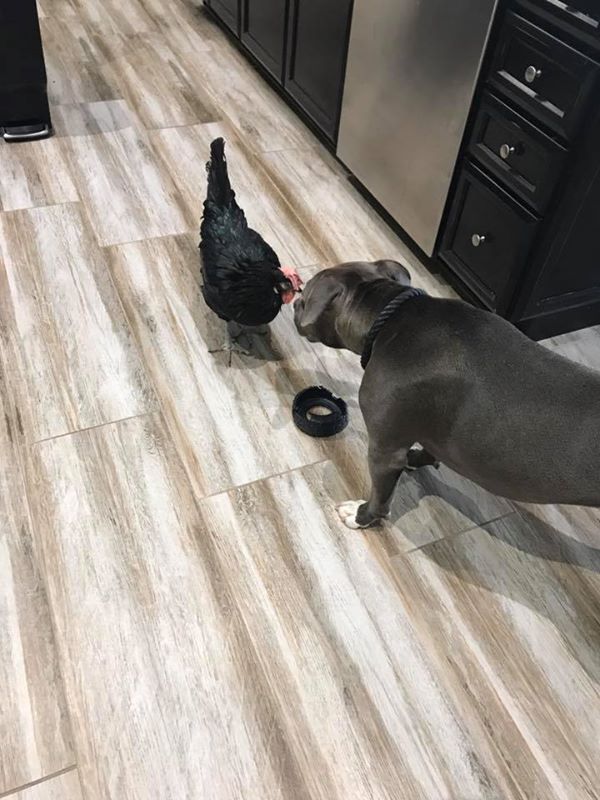 Christa had the idea to adopt two pitbull puppies so that she and the hen could overcome the pain together. And not only on their part but also on the part of Taj, the family’s pit bull, who became irretrievably attached to it when he discovered his disability.