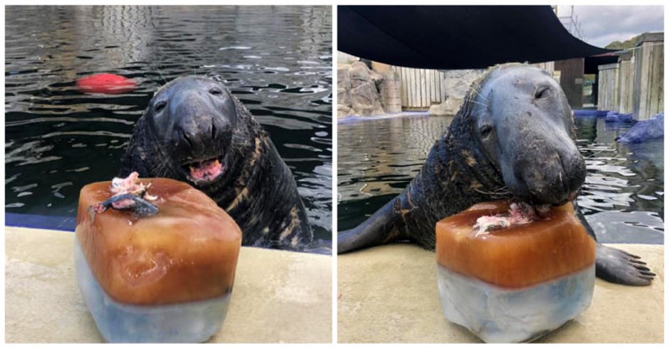 Yule logs, a gray seal, was given a gigantic fish cake for his 31st birthday.