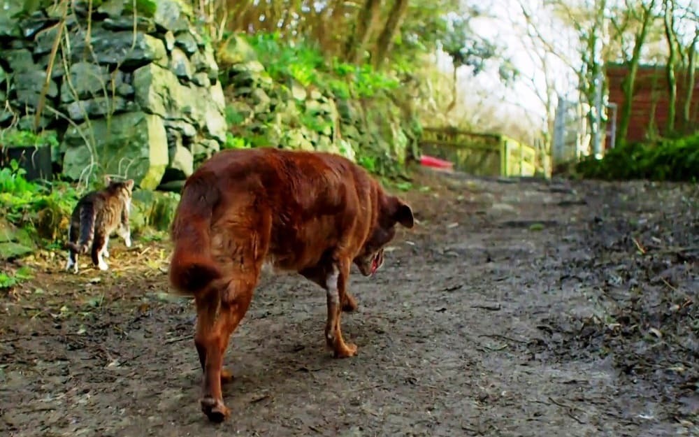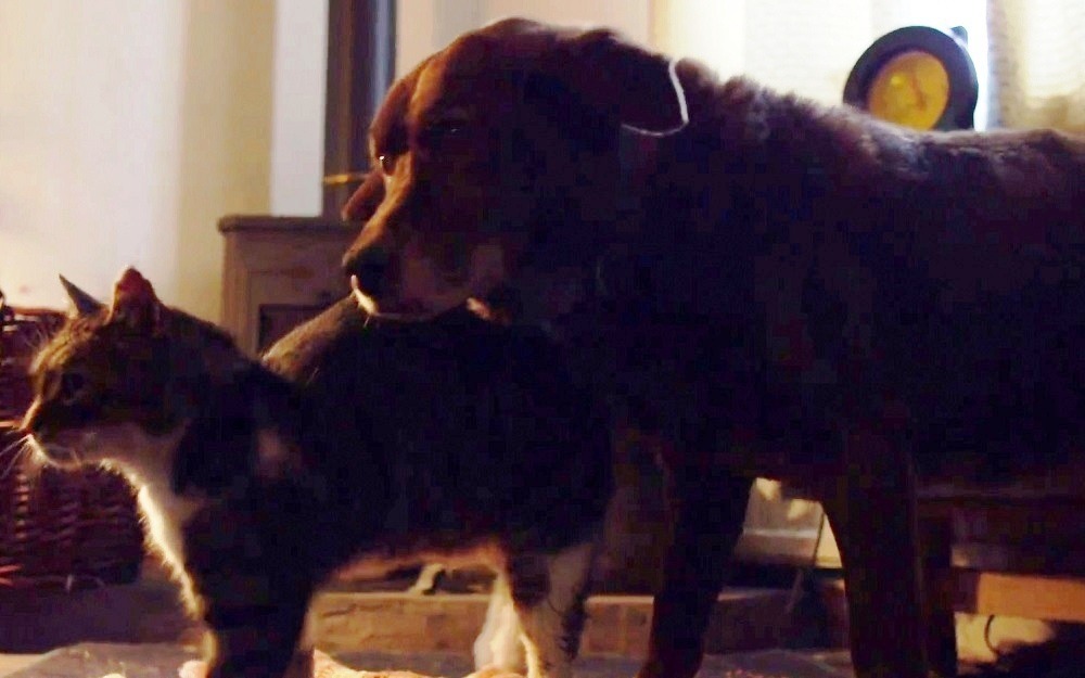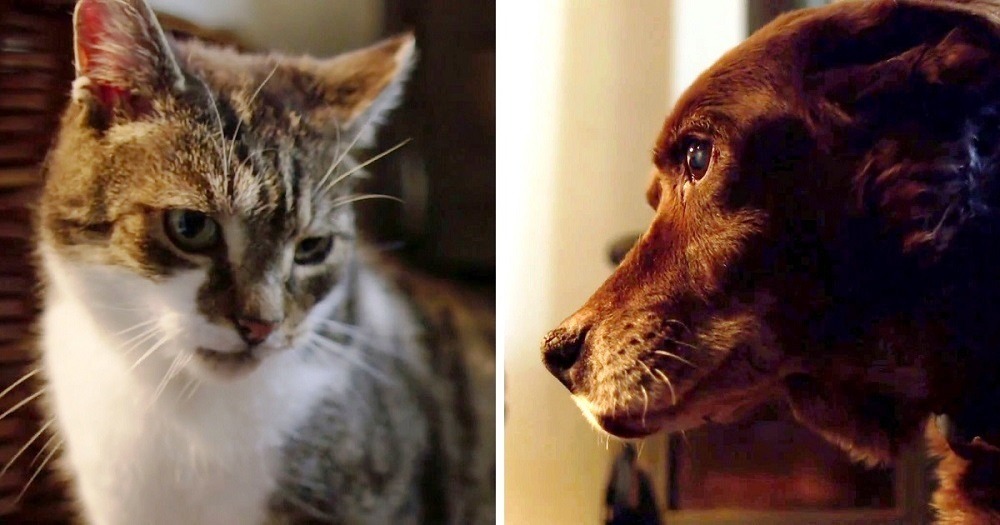 The abused and blind dog has always had trouble moving until a cat becomes his guide.